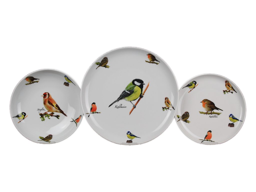 Praktická 36dílná talířová souprava z kvalitního českého porcelánu, bez barevného okraje (BB), na přání vám můžeme talířovou soupravu nakombinovat dle preferovaných motivů ptáčků (uveďte do Poznámky). Vhodná do myčky i mikrovlnné trouby.