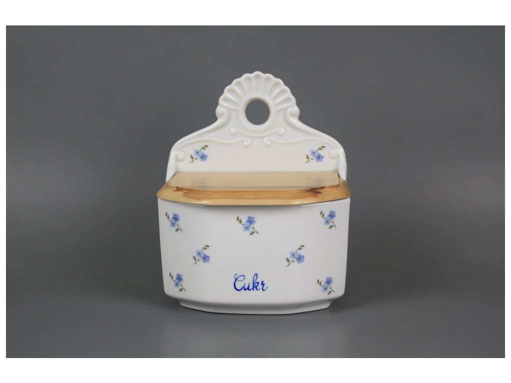 Praktická závěsná cukřenka s dřevěným víkem z kvalitního českého porcelánu, bez barevného okraje (BB).