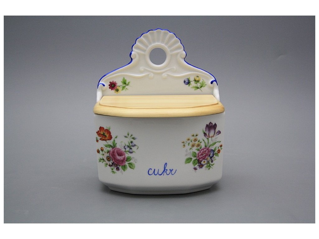 Praktische Zuckerdose mit Holzdeckel zum Aufhängen, gefertigt aus böhmischem Markenporzellan von höchster Qualität.