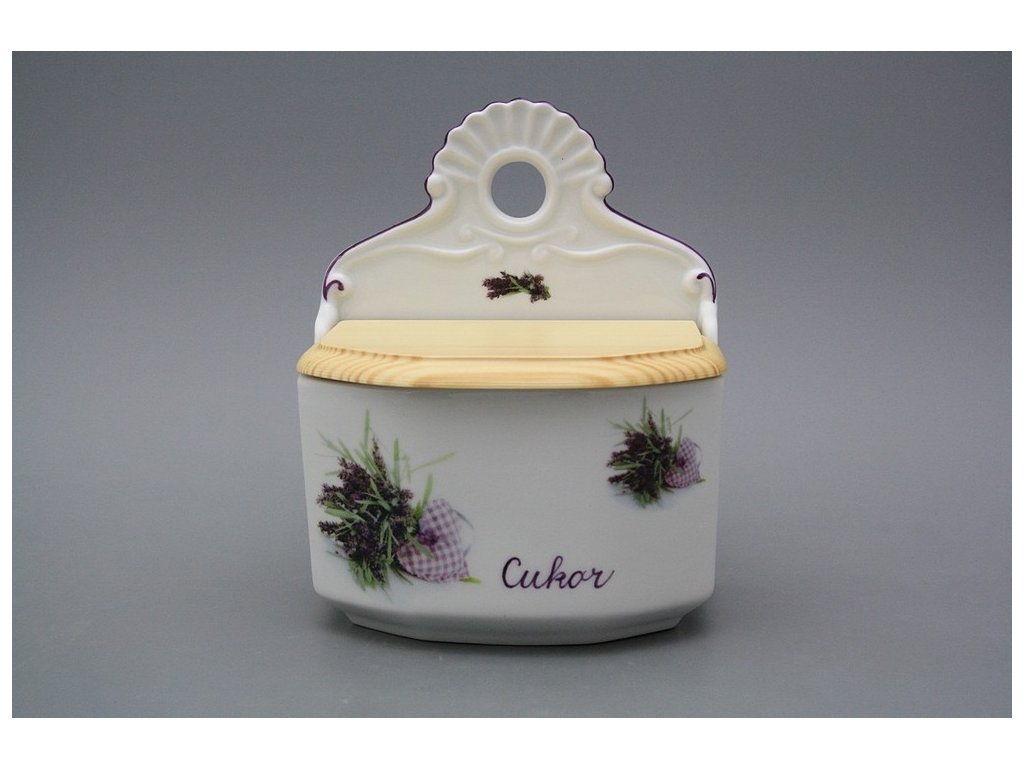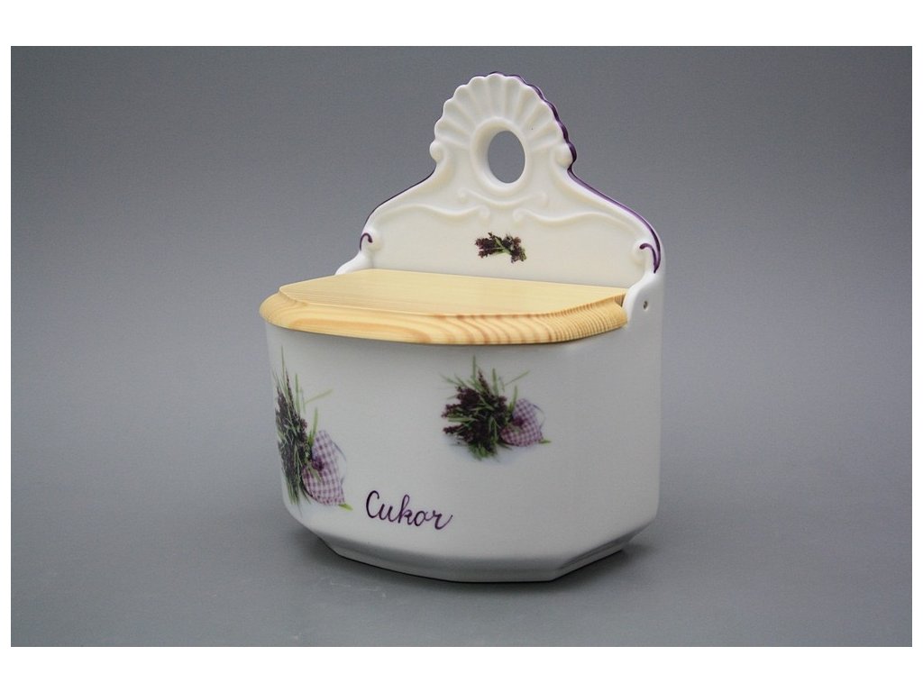 Praktische Zuckerdose mit Holzdeckel zum Aufhängen, gefertigt aus böhmischem Markenporzellan von höchster Qualität.